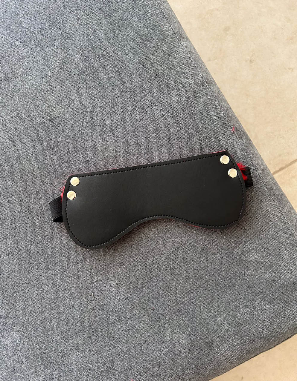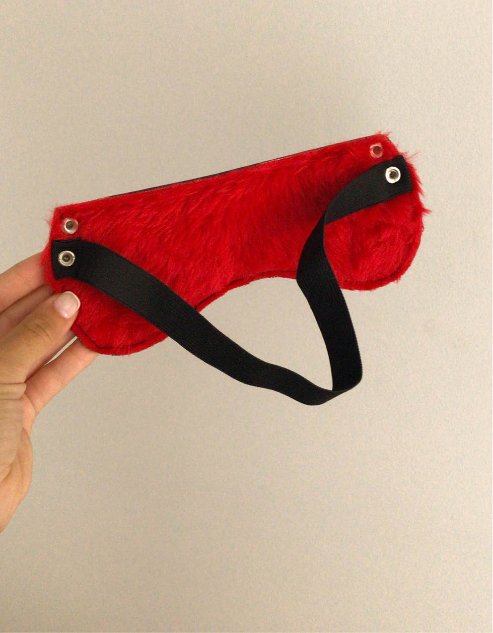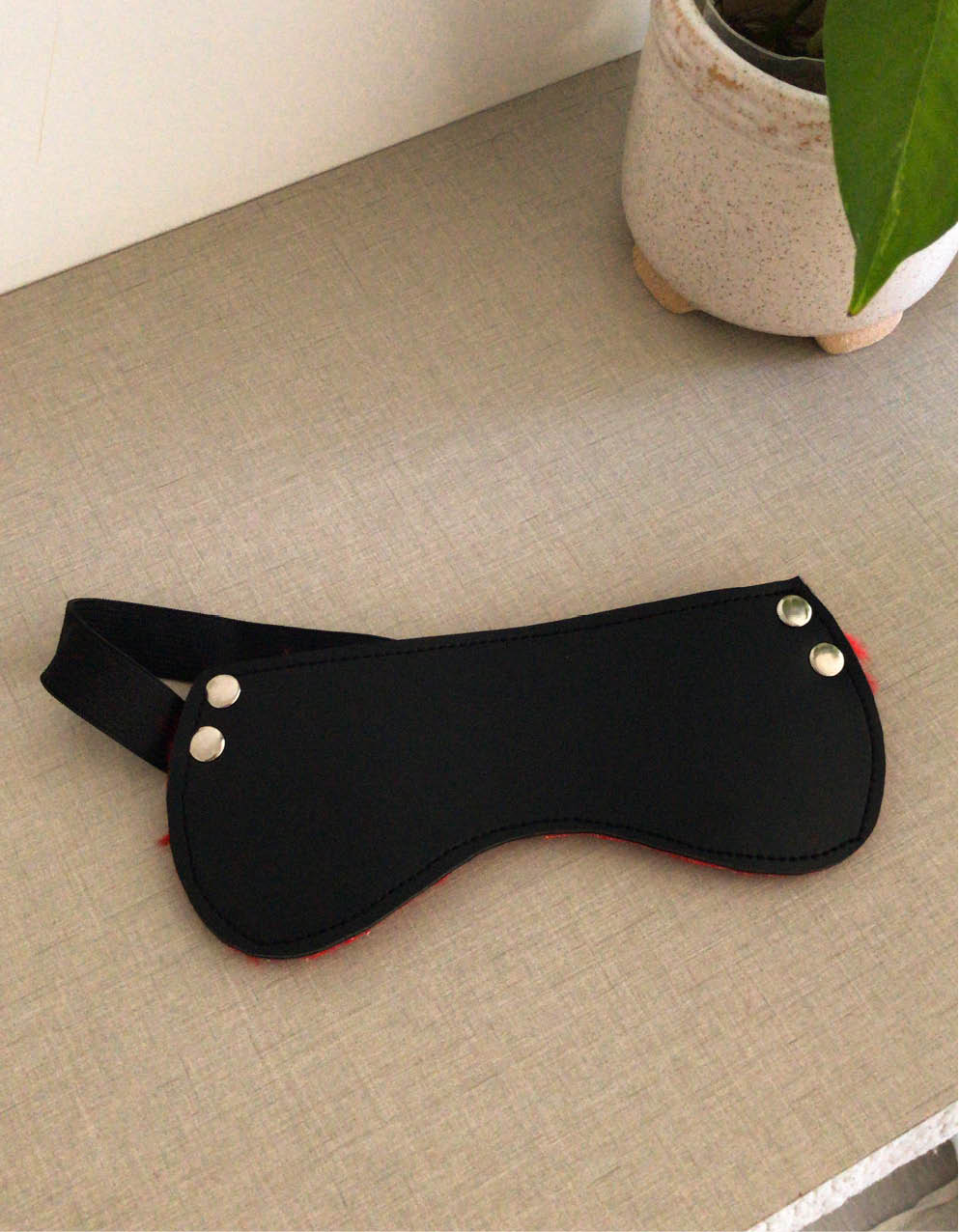 Antifaz ciego confeccionado en ecocuero, por dentro tiene peluche suave color rojo.